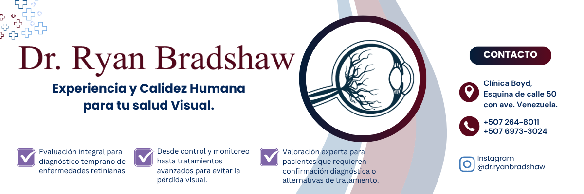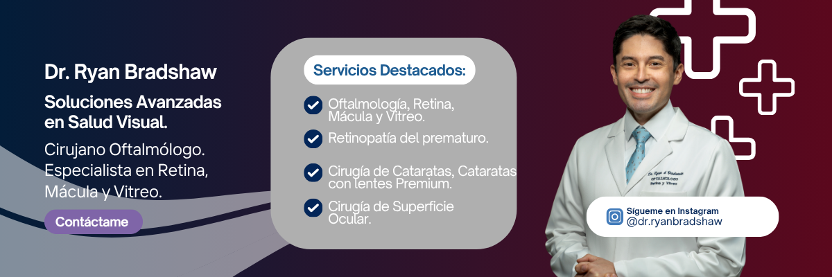 El Dr. Ryan Bradshaw es un médico oftalmólogo con una destacada trayectoria académica y clínica, especializado en el diagnóstico y tratamiento avanzado de enfermedades de la retina, mácula y vítreo. Con una formación de sub-especialidad en la Unidad Nacional de Oftalmología de Guatemala y distinguido con los más altos honores académicos en su carrera, el Dr. Bradshaw combina la precisión quirúrgica con un enfoque humano y actualizado.